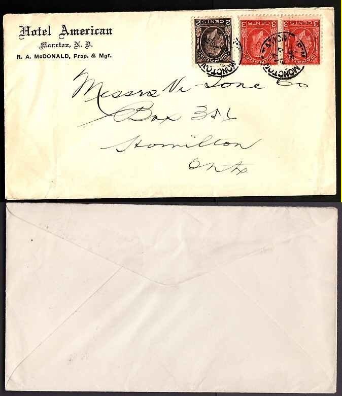 #9594 - 2c+3c(2) KGV medallion-Moncton Station,NB- Fe 7 1934 - 8c franking overpays the triple 7c domestic letter rate - CC "Hotel American Moncton NB"-
