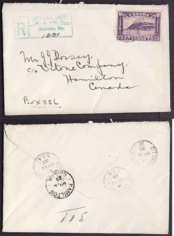 #9613 - 13c KGV Quebec Citadel reg'd-Carleton County-Ottawa,Ont Sub No. 4-Mr 13 1935-registration H/S "Ottawa Ont Sub No 4"