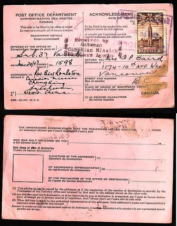 #9639 - 10c Parliament on AR card to Canadian Mission , Chungking China - Vancouver , BC - Mar 22 1943 - 10c franking pays the fee for the Acknowledge of Receipt card for registered mail -stamped-"Received by Gateman Mission Business Agency"-