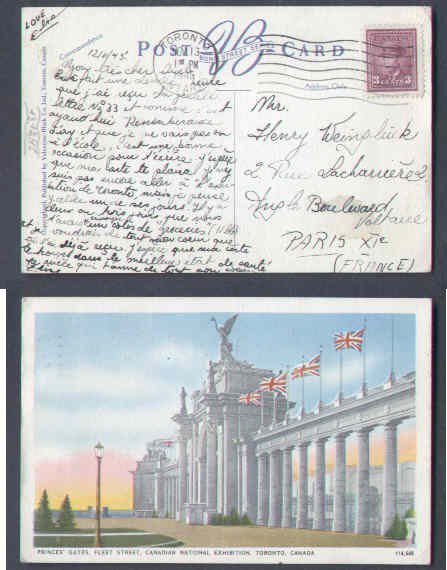 #9663 - 3c KGVI war on p/c to Paris-York County-Toronto,Ont-Nov 13 1945 -3c franking pays the preferred foreign postcard rate to Paris -