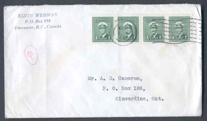 Scan#9707-1c(4) KGVI war [coil strip of 4 #263]-blackout [Vancouver,BC ] cancel - Nov 17 1944 Member of the Canadian Stamp Dealers Association and have been serving the collector since 1975.Canadian buyers - I will cover your GST/HST costs .