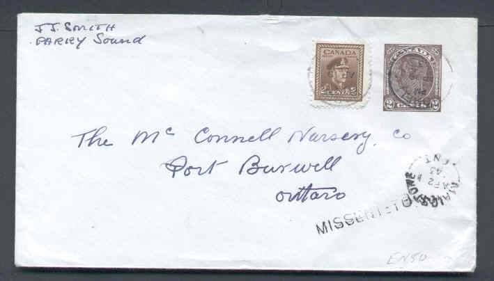 #9728 - 2c KGVI stationery uprated with 2c KGVI war-Parry Sound Dist-Nobel,Ont-Ap 19 1943-H/S "Missent to" Maidstone,Ont Ap 31,1943 in Essex county -