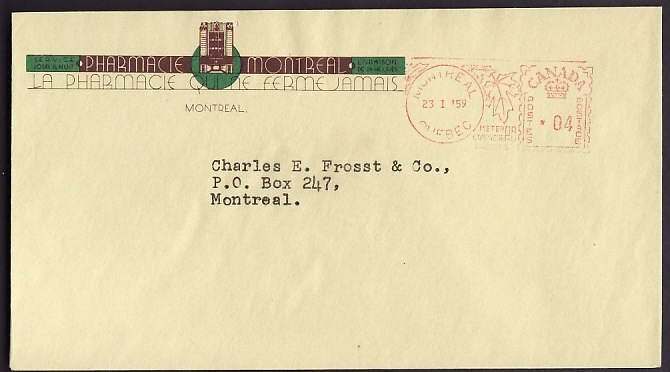 #10009- 4c meter #148075 - Montreal,Quebec-23 1 1959-CC illustrated ad "Pharmacie Montreal"Member of the Canadian Stamp Dealers Association and have been serving the collector since 1975.Canadian buyers - I will cover your GST/HST costs .
