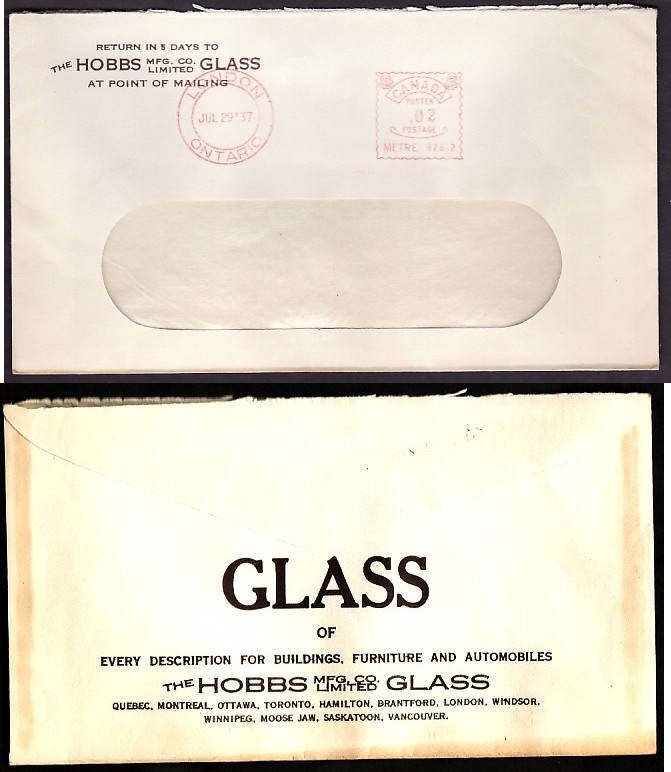 #10010 - 2c meter paying drop letter rate-Middlesex County-London,Ont-Jul 29 1937-advertising on back -