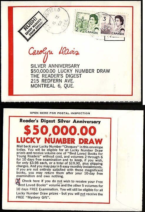 #10016 - 2c+3c Centennials on Reader's Digest "Silver Anniversary Lucky Number Draw" return envelope - Strongfield , Sask - 8 II 1968