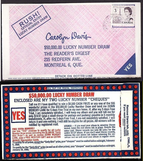 #10021 - 3c Centennial on Reader's Digest "$50,000.00 Lucky Number Draw" return envelope DML/L - Spiritwood , Sask - I ? 1968