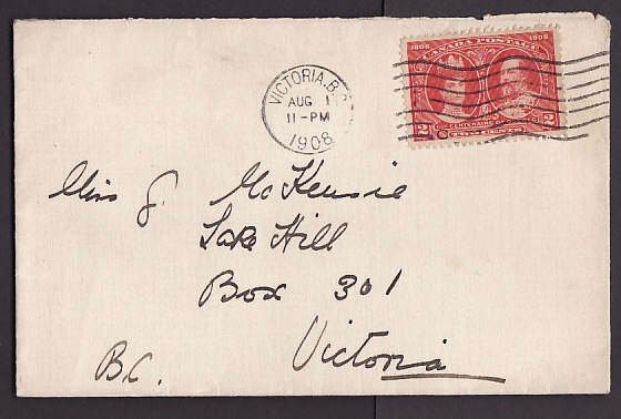 #10044 - 2c Tercentenary - Victoria , BC - Au 1 1908 -2c franking pays the drop letter rate [ rate changed to 1c seven days later ]