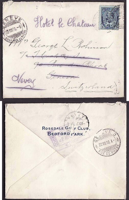 #10087-5c Edward-Geneva,Switzerland,re-directed-York Cnty-Toronto,Ont-Au 12 1910 - 5c franking pays the UPU letter rate to Switzerland - B/S Geneva 22 VIII 1910 ] and re-directed by Thomas Cook & Son [ B/S 22 Aug 1910 ] to Hotel le Chateau , Vevey , Switzerland [ B/S 21 VIII 1910 ] - return address on back flap "Rosedale Golf Club" -