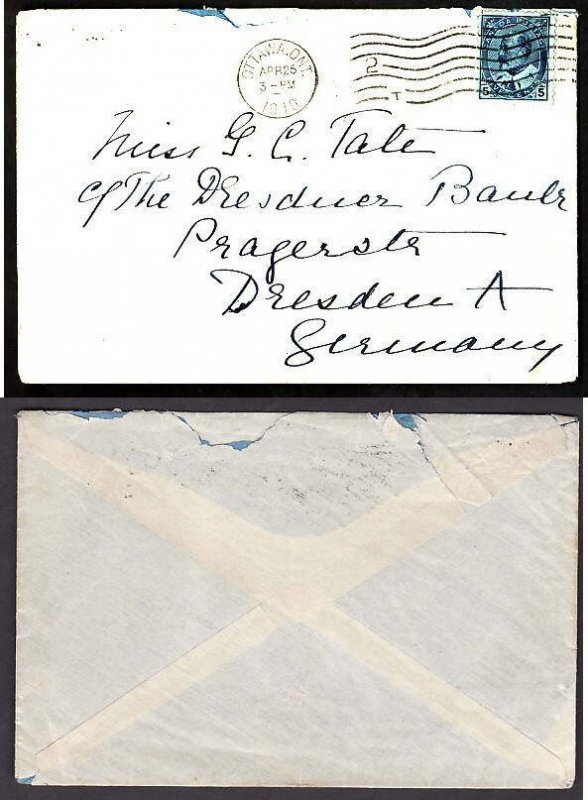 #10089 - 5c Edward to Germany-Carleton County-Ottawa,Ont-Apr 25 1910- 5c franking pays the UPU letter rate to Germany