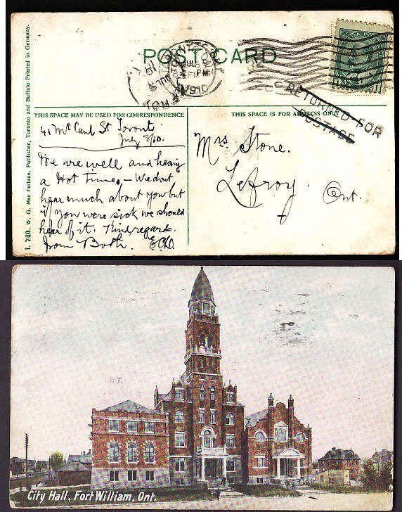 #10094 - initially no stamp with Toronto , Ont Jul 8 1910 cancel - H/S "Returned for Postage" - 1c Edward added - York County - Toronto , Ont - Jul 9 1910 - receiving cancel Simcoe County - Lefroy , Ont Jul 9 1910 - view side shows "City Hall , Fort William , Ont." -
