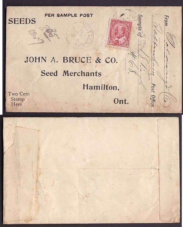 #10135-2c Edward-pre-printed envelope" Per Sample Post,Seeds,2c stamp here" - Simcoe Cnty-Tottenham , Ont - De 6 1906 - 2c franking pays the third class rate