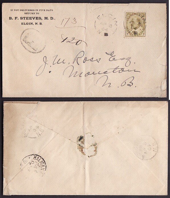#10153-7c Edward reg'd-Elgin,NB-Ap 8 1904-CC "B.F. Steeves , MD" -Member of the Canadian Stamp Dealers Association and have been serving the collector since 1975.Canadian buyers - I will cover your GST/HST costs .