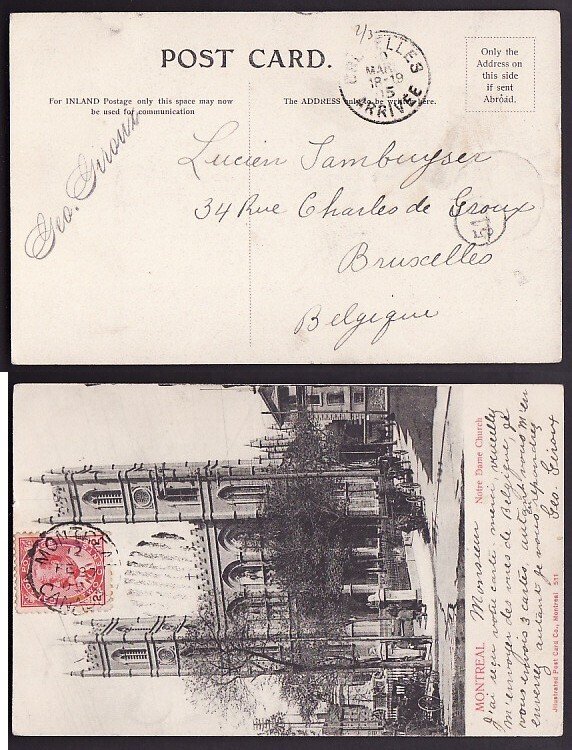 #10158-2c Edward-p/c to Belgium-Montreal,Canada duplex-Fe 27 1905- receiving cancel "Bruxelles Mar 18 1905" - 2c franking pays the UPU postcard rate to Brussels -