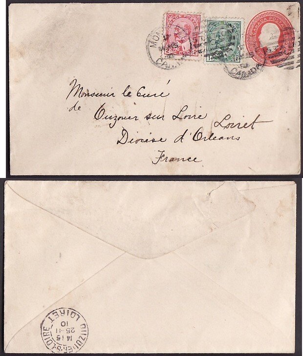 #10169-1c+2c Edwards uprating a 2c Edward stationery to France-Montreal,Canada Station C duplex cancel - No 5 1910 - receiving cancel "Loiret 25 11 10 " - 5c franking pays the UPU letter rate to France -