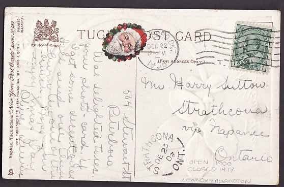 #10184 - 1c KEVII on p/c-L&A Cty-Strathcona,Ont single broken circle-De 23 1908 - Member of the Canadian Stamp Dealers Association and have been serving the collector since 1975.Canadian buyers - I will cover your GST/HST costs .
