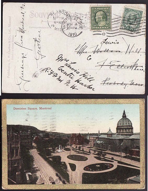 #10185-1c Edward-p/c-USA -re-addressed and re-mailed from Peabody , Mass No 8 1910 with 1c Franklin added to pay the USA rate - Montreal , Que - Nov 4 1910- view side shows "Dominion Square , Montreal" -