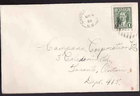 #10237 - 1c KGVI mufti - Charlo, NB single broken circle - Mr 4 1938 - Member of the Canadian Stamp Dealers Association and have been serving the collector since 1975.Canadian buyers - I will cover your GST/HST costs .