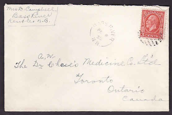 #10270 - 3c KGV medallion - Bass River, NB single broken circle - Fe 8 1935 Member of the Canadian Stamp Dealers Association and have been serving the collector since 1975.Canadian buyers - I will cover your GST/HST costs .