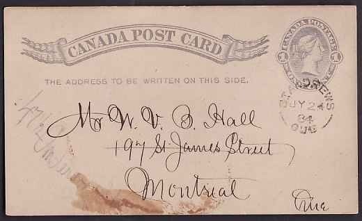 #10328 - 1c QV p/c- St. Andrew's, Que single broken circle - Jy 24 1884 - B/S Montreal carrier's handstamp "5 Jul 25" - Member of the Canadian Stamp Dealers Association and have been serving the collector since 1975.Canadian buyers - I will cover your GST/HST costs .