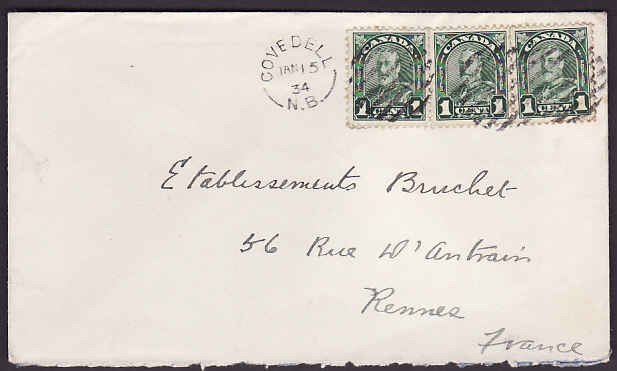 #10359 - 1c(3) KGV arch to France - Covedell, NB single broken circle - Jan 15 1934 - franking pays the 3c preferred foreign rate to France - B/S "Rennes 31 1 1934"