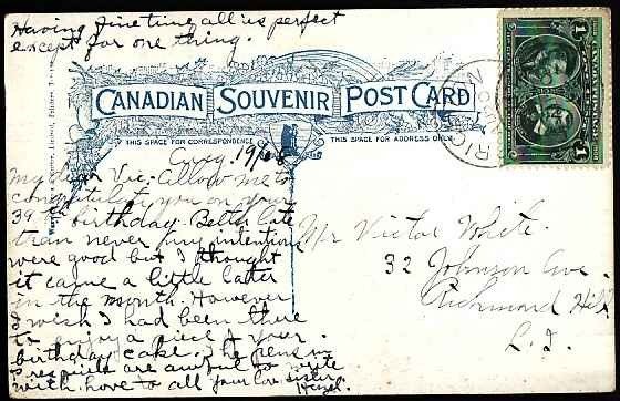 #10379 - 1c Tercentenary on postcard - Northumberland County- Brighton, Ont - Au 20 1908 -view side shows "On the Seguin River, Georgian Bay District" -