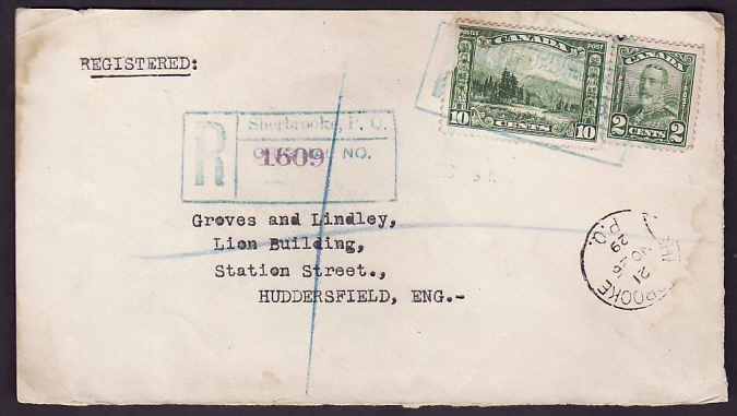 #10458 - 2c KGV scroll+10c Mount Hurd [ front only ] reg'd to England-Sherbrooke,PQ- No 26 1929 - 12c franking pays the 2c Empire letter rate [ effective Dec 25 1928 to Jy 1 1931 ] + 10c registration rate -