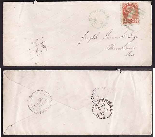 #10478 - 3c Small Queen - Rock Island , CE single broken circle [ 21 mm ]in green - Ju 10 1876 - B/S Dunham , CE double broken circle Ju 13 1876 , Stanstead Station , CE single broken circle Ju 13 1876 -