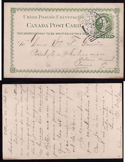 #11215 - 2c UPU Canada Post Card to France - Carleton County - Ottawa, Ont squared circle cancel - 3 / Jy 24 / 1894 - Paris receiving mark Aou 1 1894 -