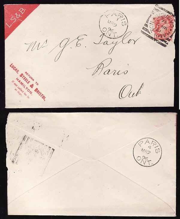 #11740 - 3c Small Queen on illustrated advertising [ Lucas, Steele & Bristol, Hamilton ] cover, cancelled with a Hamilton, Ont squared circle - Hamilton, Ont - 17 / Mr 7 / 1896