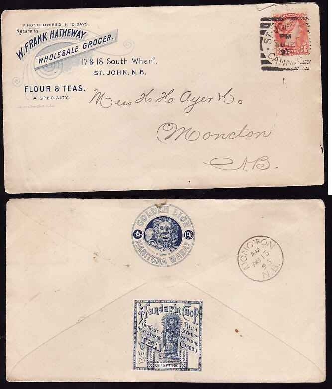 #11743 - 3c Small Queen on illustrated advertising [ W. Frank Hatheway Wholesale Grocer - St. John, NB ] cover [ front and back ], cancelled with a St. John, NB squared circle - St. John, NB - PM / Au 12 / 1895