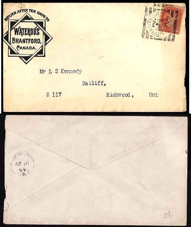 #11745 - 3c Small Queen on illustrated advertising [ Waterous - Brantford, Canada ] cover, cancelled with a Brantford, Ont squared circle -Brantford, Ont - PM / Ap 9 / 1894