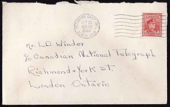 #9541 - 2c KGV medallion + 1c ? [ stamp fell off ]-Huron County-Dungannon,Ont-De 28 , 1935 - H/S "Fell Off in Transit"-Member of the Canadian Stamp Dealers Association and have been serving the collector since 1975.Canadian buyers - I will cover your GST/HST costs .