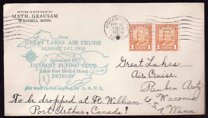 #12126 - 1c(2) KGV Scroll - Houghton, Mich - Aug 12 1930 - illustrated cachet for "First Great Lakes Air Cruise Aug. 7-17 1930" - M/S "To be dropped at Fort William, Port Arthur, Canada" - Canadian franking accepted or at least not charged postage due -