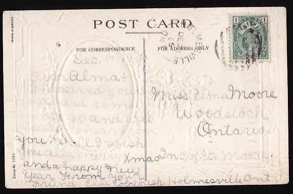 #12884 - 1c Edward on p/c-Huron Cnty-Holmesville,Ont single broken circle-De 20 1909- Member of the Canadian Stamp Dealers Association and have been ...