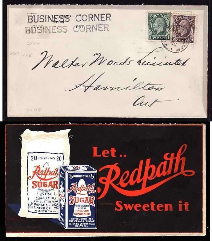 #13111-2c+1c KGV medallions on cover with all over back illustrated advertising for Redpath Sugar - Hamilton & Palmerston RPO / . [ ON 197 RF A-2 ] - 1935