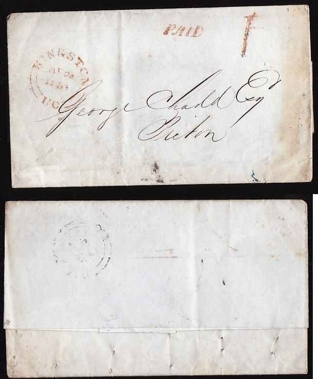 #13123 - Stampless circular delivery letter - rated "PAID 1" red - Frontenac County - Kingston, UC double broken circle - Ap 24 1855 - B/S Picton, UC double broken circle