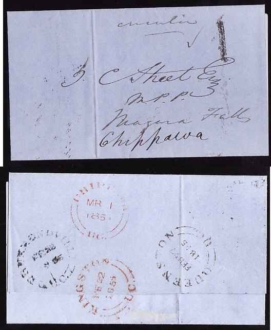 #13124 - Stampless circular delivery letter addressed to Niagara Falls and re-addressed to Chippawa - rated "1" black - B/S Frontenac County - Kingston, UC double broken circle - Fe 22 1855, Lincoln County - Queenston, UC double broken circle - Fe 27 1855 - Welland County - Drummondville, UC double broken circle - Fe 22 1855, Welland County , Chippawa UC double broken circle - Mr 1 1855 -