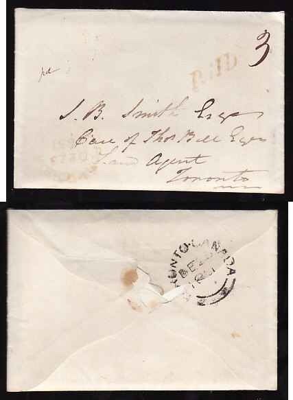 #13145 - Stampless with enclosure regarding the sale of a saw mill - Peel County - Port Credit, UC double broken circle [ red ] - De 23 1851 - rated "Paid 3" red - B/S York County - Toronto-Canada double broken circle - De 23 1851 -