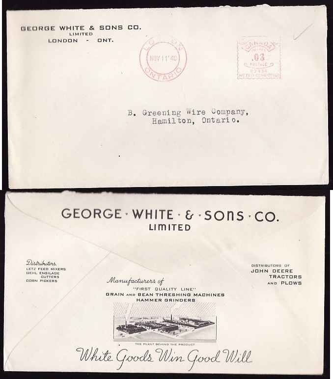 #13181 - 3c meter [ #83434 ] advertising cover for George White & Sons - Middlesex County - London, Ont - Nov 11 1940 -Member of the Canadian Stamp De...