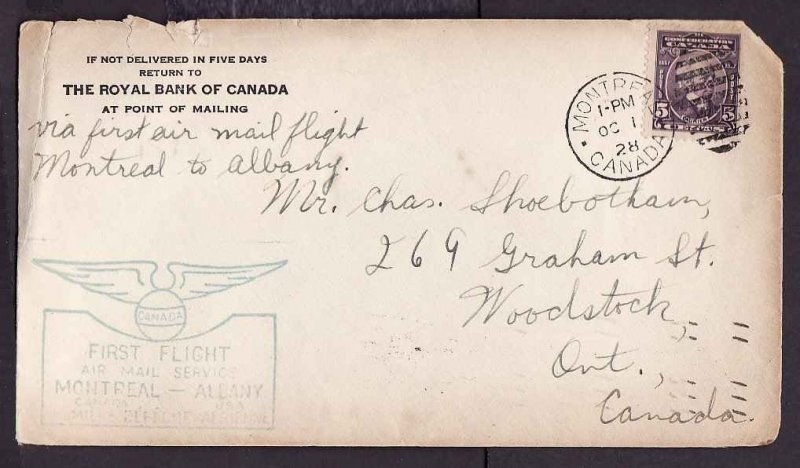 #13186 - 5c Laurier [ AAMC 2847] on first flight Montreal to Albany - Montreal, Canada duplex - Oc 1 1928 Member of the Canadian Stamp Dealers Associ...