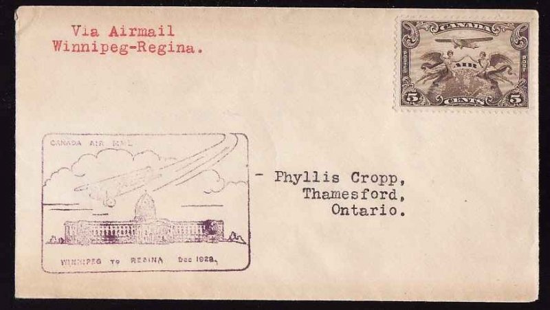 #13187 - 5c Airmail [ AAMC 2853] on first flight Winnipeg to Regina - B/S Regina Sask. - Dec 10 1928 Member of the Canadian Stamp Dealers Association...