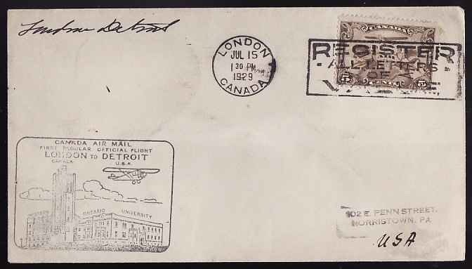 #13218 - 5c Airmail [ AAMC 2945h] on first flight London to Detroit - London, Ont - Jul 15 1929Member of the Canadian Stamp Dealers Association and ha...