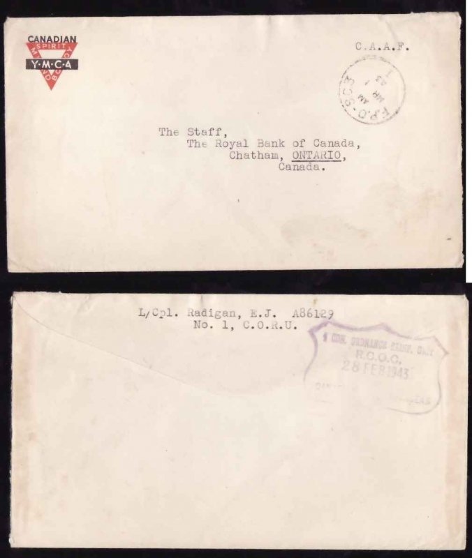 #13225-Military-FPO SC3-Mr 1 1943-CC "YMCA"-B/S "Cdn. Ordinance Reinf. Unit"-28 Feb 1943- Member of the Canadian Stamp Dealers Association and have b...