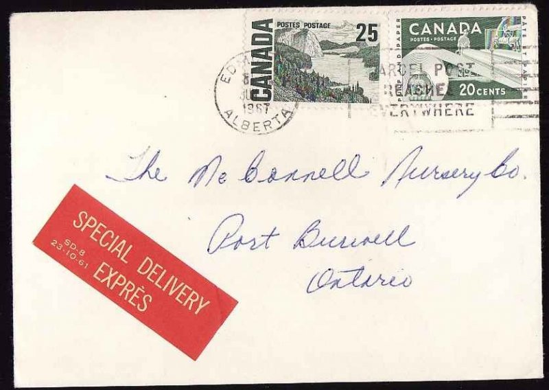 #13407-25c + 20c Special Delivery-Edmonton,Alberta-Jun 1 1967-1st day of new 40c rate for special delivery- Member of the Canadian Stamp Dealers Asso...