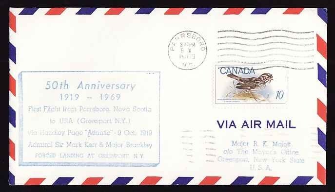 #13442 - 10c Ipswich Sparrow [ AAMC A6962 ] 50th anniversary [ blue cachet ] - commemorating the first airmail flight between Parrsboro, NS & Greenport, NY USA - Parrsboro, NS - 9 X 1969