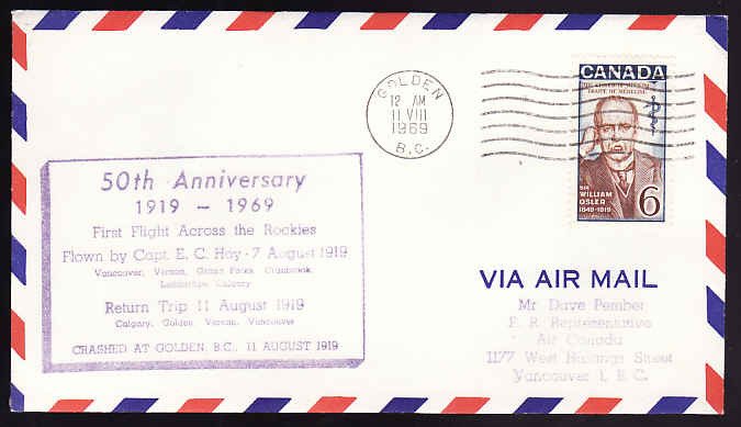 #13452 - 6c Osler [ AAMC A6950 ] 50th anniversary purple cachet ] - commemorating the first flight across the Rockies - Golden, BC - 11 VIII 1969Membe...