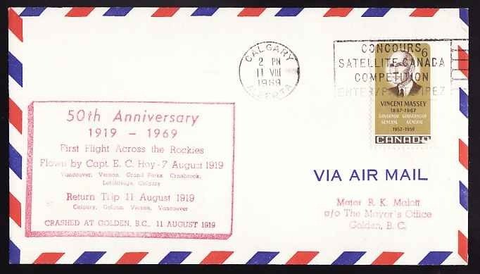 #13453 - 6c Massey [ AAMC A6950 ] 50th anniversary [ red cachet ] - commemorating the first flight across the Rockies - Calgary, Alberta - 11 VIII 1969