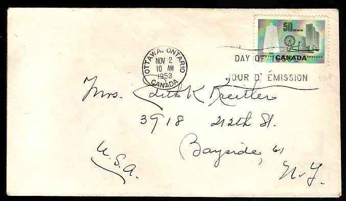 #13522 - 50c textile [#334] on First day cover - Ottawa Ontario,Canada - No 2 1953 -Member of the Canadian Stamp Dealers Association and have been ser...