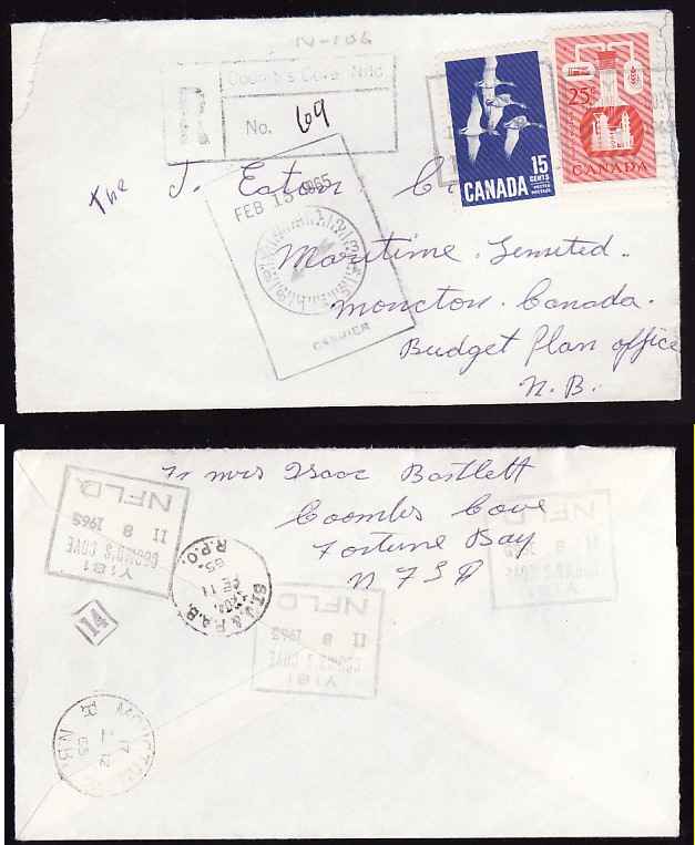 #13586-15c+25c reg'd-Coomb's Cove,Nfld-Feb 8 1965-B/S St J & PAB/RPO-N106-Member of the Canadian Stamp Dealers Association and have been serving the c...