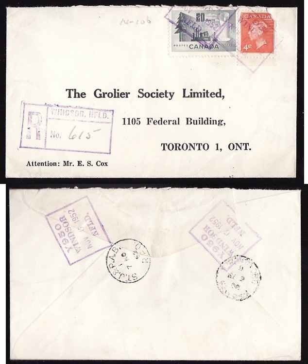 #13589-4c+20c reg'd-Windsor-Nov 6 1952-B/S St J&PAB/ RPO-1 No 7 1952-[NL 58]-Member of the Canadian Stamp Dealers Association and have been serving th...